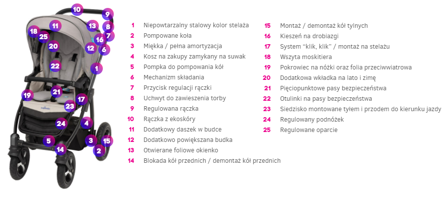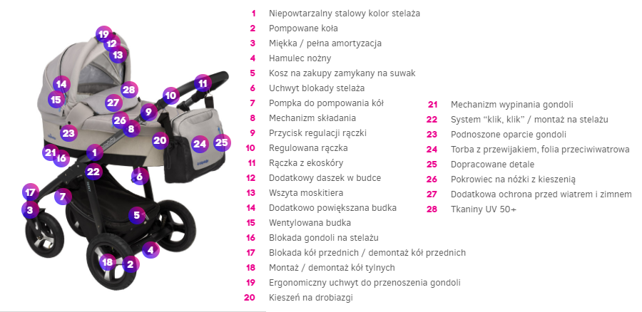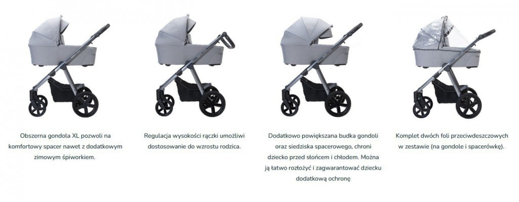 - pałąk bezpieczeństwa i 5-punktowe pasy w spacerówce- osłona p/deszczowa na spacerówkę i gondolę