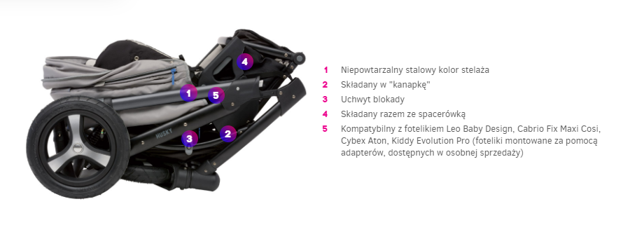 Na stelaż wózka HUSKY za pomocą adaptera można montować foteliki MaxiCosi, Safety 1st, Espiro, Babydesign.