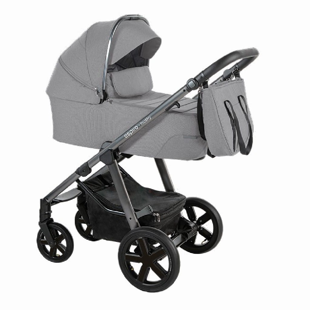 Kompaktowy wózek głęboko-spacerowy BABY DESIGN Husky na dużych pompowanych kołach, z siedziskiem spacerowym montowanym w dwóch kierunkach jazdy.