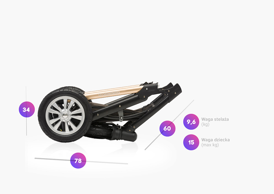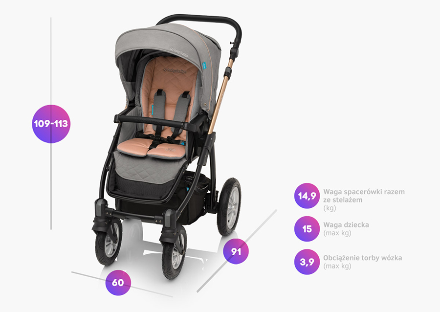 oraz unikalny kolor stelaża, tworzące oryginalny design, zdecydowanie wyróżniający się na tle innych wózków.