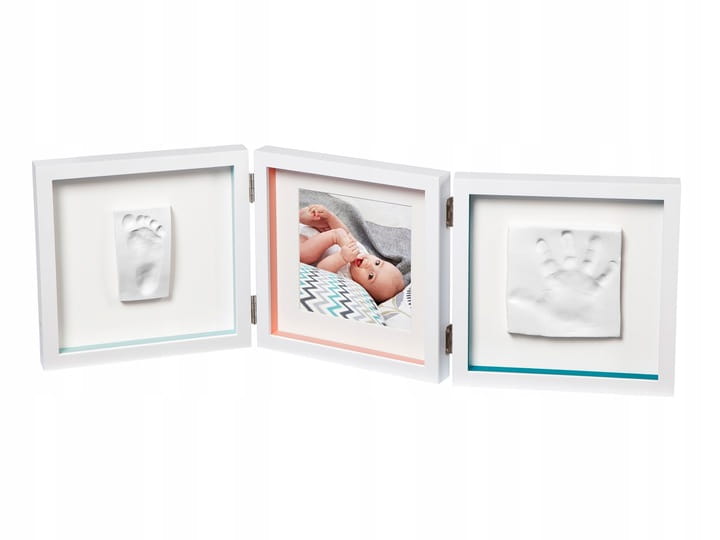 Nowoczesna, drewniana ramka w białym kolorze ma wszystko, czego potrzebujesz, aby stworzyć osobistą pamiątkę z odciskiem malutkich rączek lub stópek dziecka.