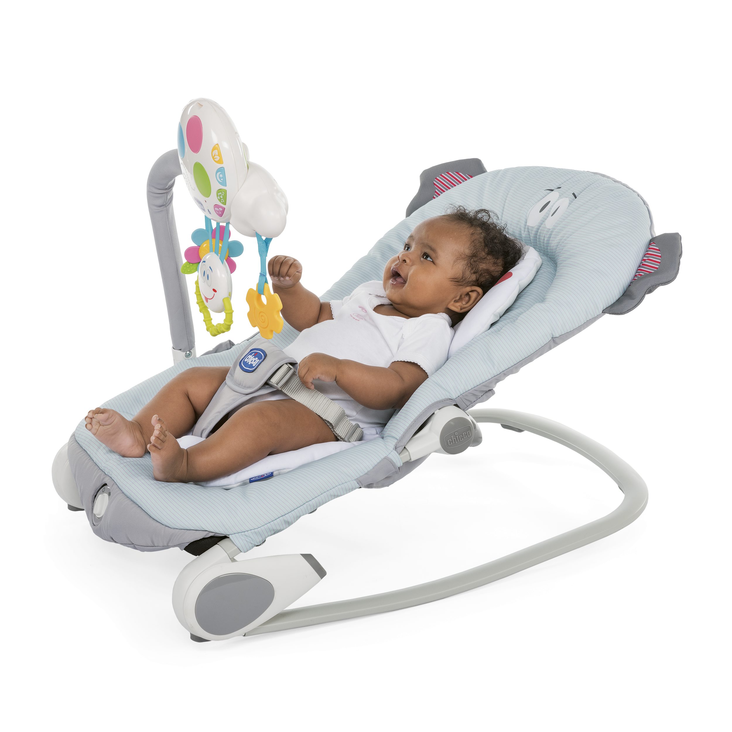 Do leżaczka dołączono zestaw kolorowych zawieszek, które zostały zaprojektowane tak, aby poprzez dobór odpowiednich materiałów oraz kolorów, wspierać rozwój manualny i psychologiczny dziecka. Efekty świetlne i dźwiękowe dodatkowo stymulują zmysły. Bardzo cenną funkcjonalnością w modelu Chicco Balloon jest możliwość nagrania i odtwarzania specjalnej wiadomości dla dziecka (30sek.). Panel z zawieszkami można z czasem odpiąć i przyczepić do łóżeczka starszego dziecka.