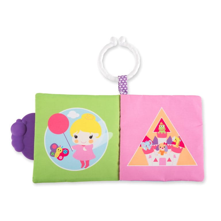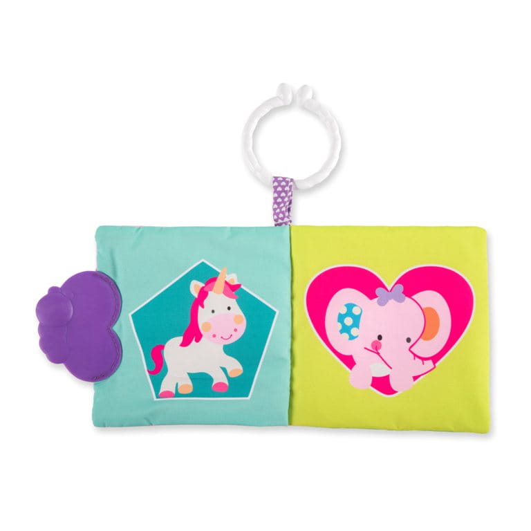 Urocza książeczka wykonana z miękkiej tkaniny z szeleszczącymi elementami i miękkim gryzakiem.