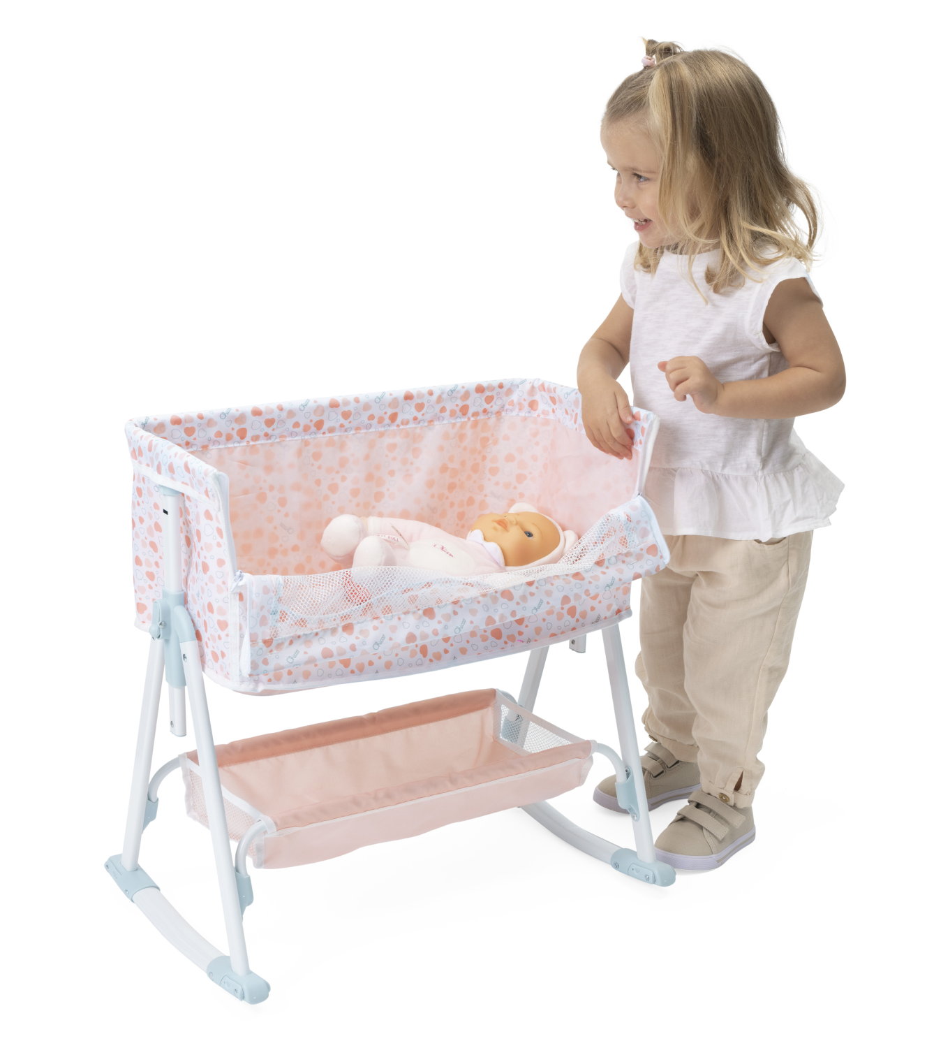 W zestawie: łóżeczko z regulacją i schowkiem (lalka nie jest dołączona)