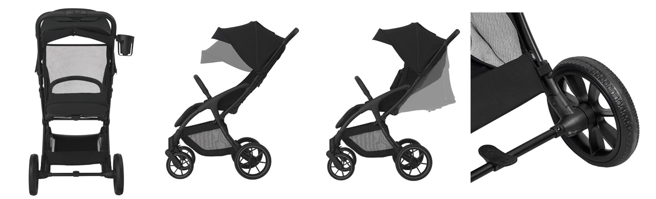 System automatycznego składania autofolding, świetna amortyzacja, bezobsługowe, duże koła żelowe, panoramiczny panel wentylacyjny oraz dodatkowe okienko w budce, przestronna budka, oparcie wózka do pozycji leżącej, hamulec stop&go