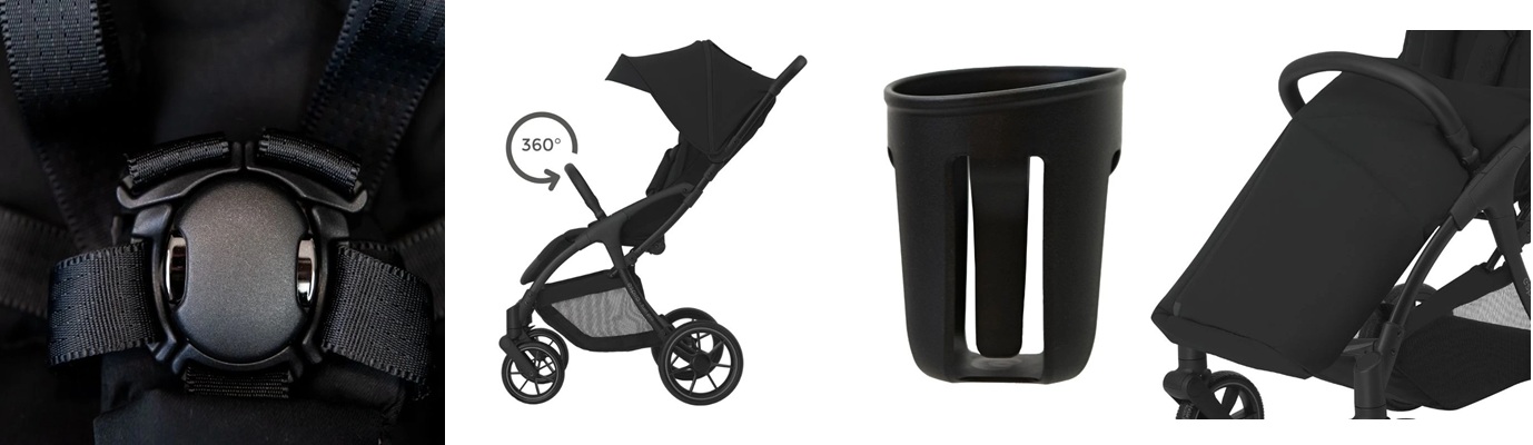 Jest wyposażony w obrotową barierkę 360, którą po złożeniu wózka także można złożyć