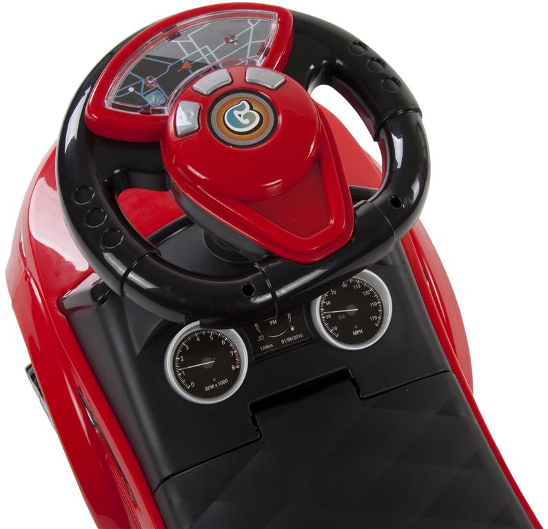 Jeździk może służyć jako pojazd do jeżdżenia, jako pchaczyk z miejscem na zabawki (schowek pod siedziskiem), a także dla maluchów zafascynowanych dużymi autami jako ich pierwsze auto z prawdziwą kierownicą i klaksonem.