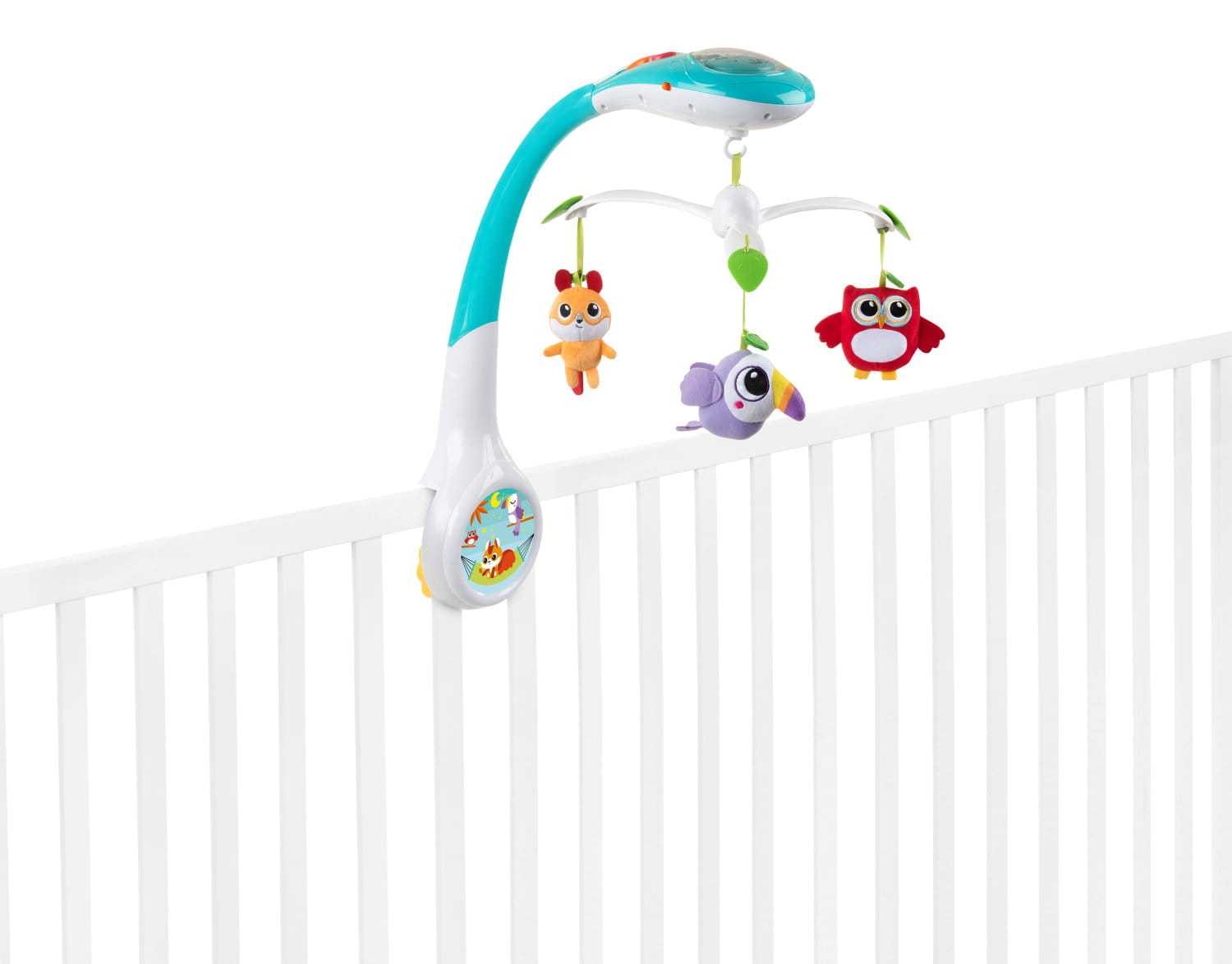 - rotacja, kiedy 3 miękkie pluszowe zwierzątka - zawieszki obracają się nad głową dziecka, tworząc magiczną atmosferę;
