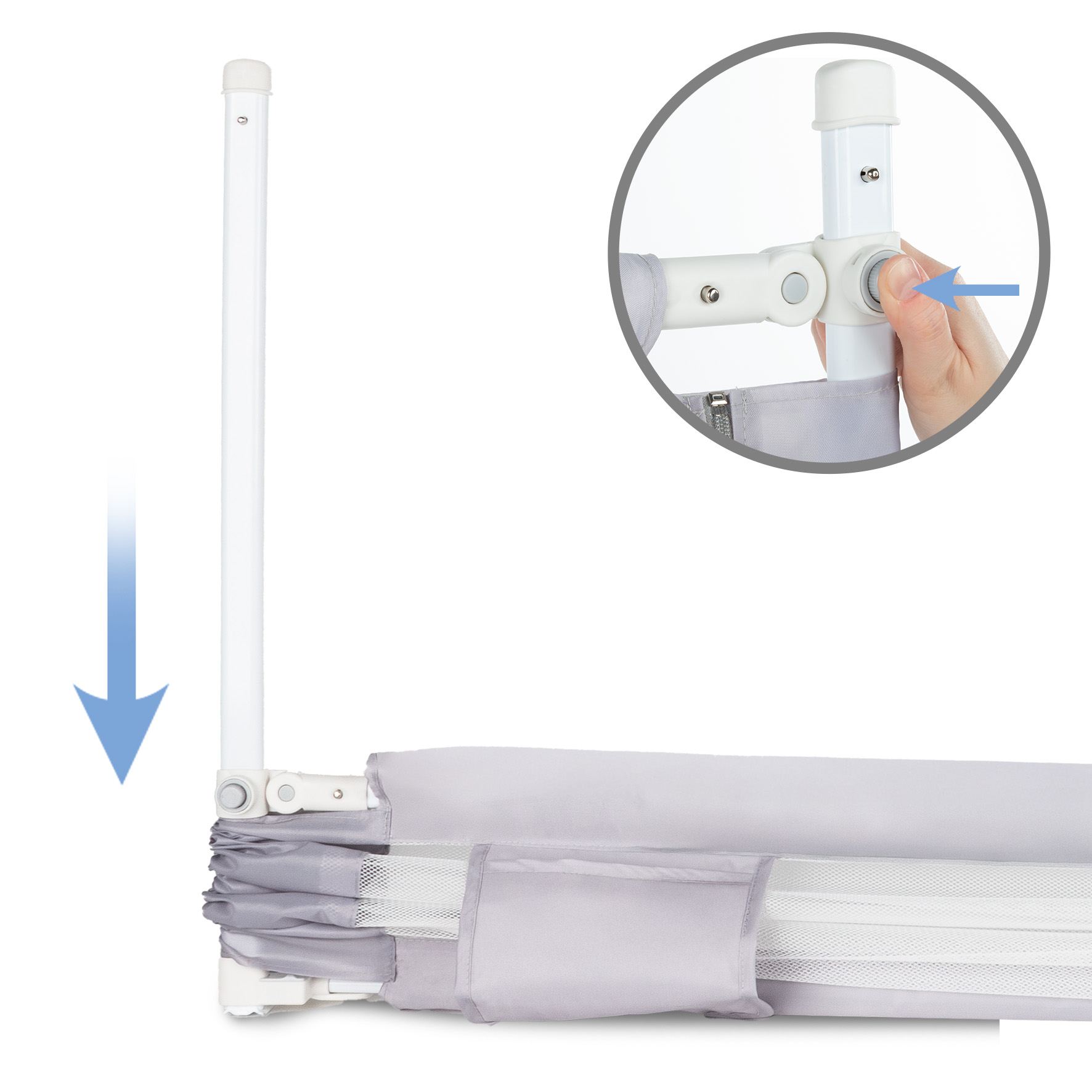 - 30-stopniowa regulacja wysokości: Dopasujesz barierkę do każdego materaca i ramy łóżka (od 65 do 95 cm wysokości). Oznacza to maksymalną stabilność. Dziecko nie wyślizgnie się pod spodem.
