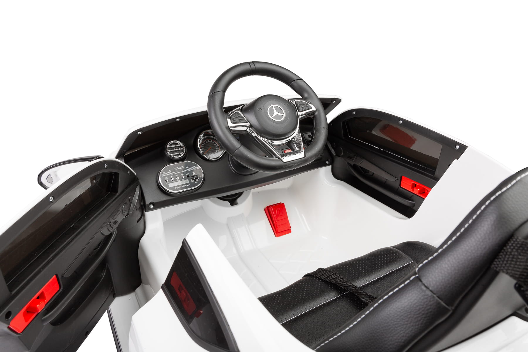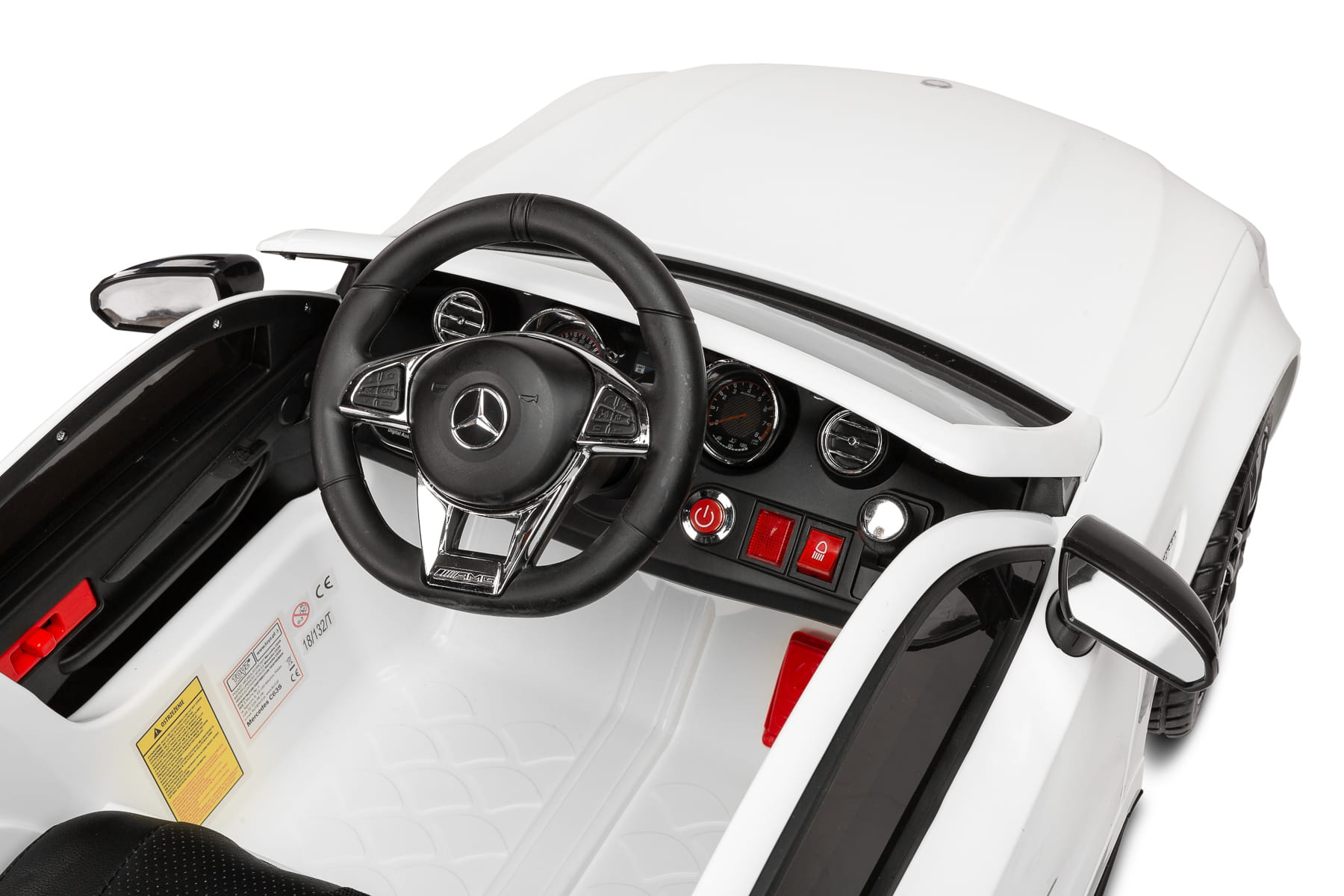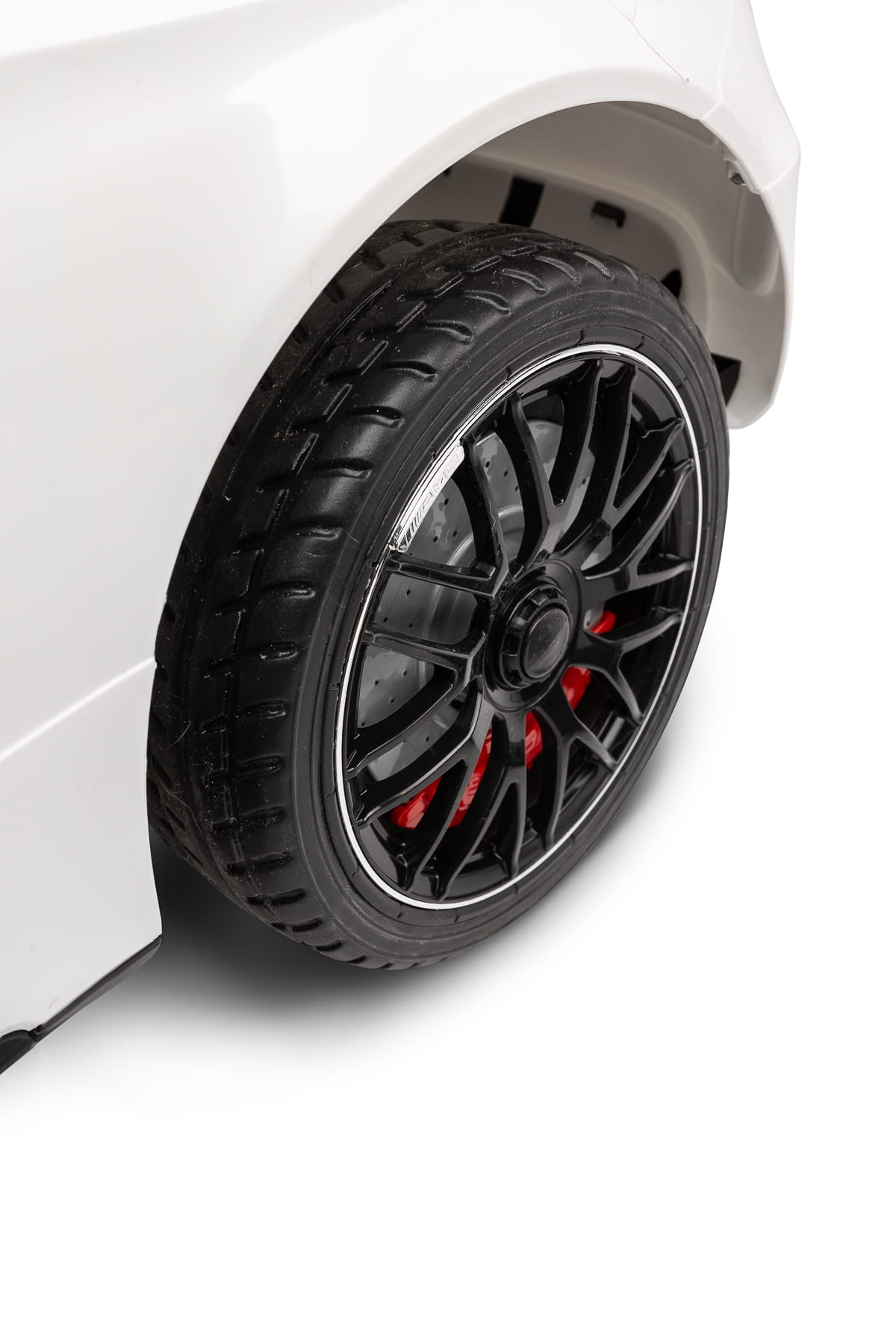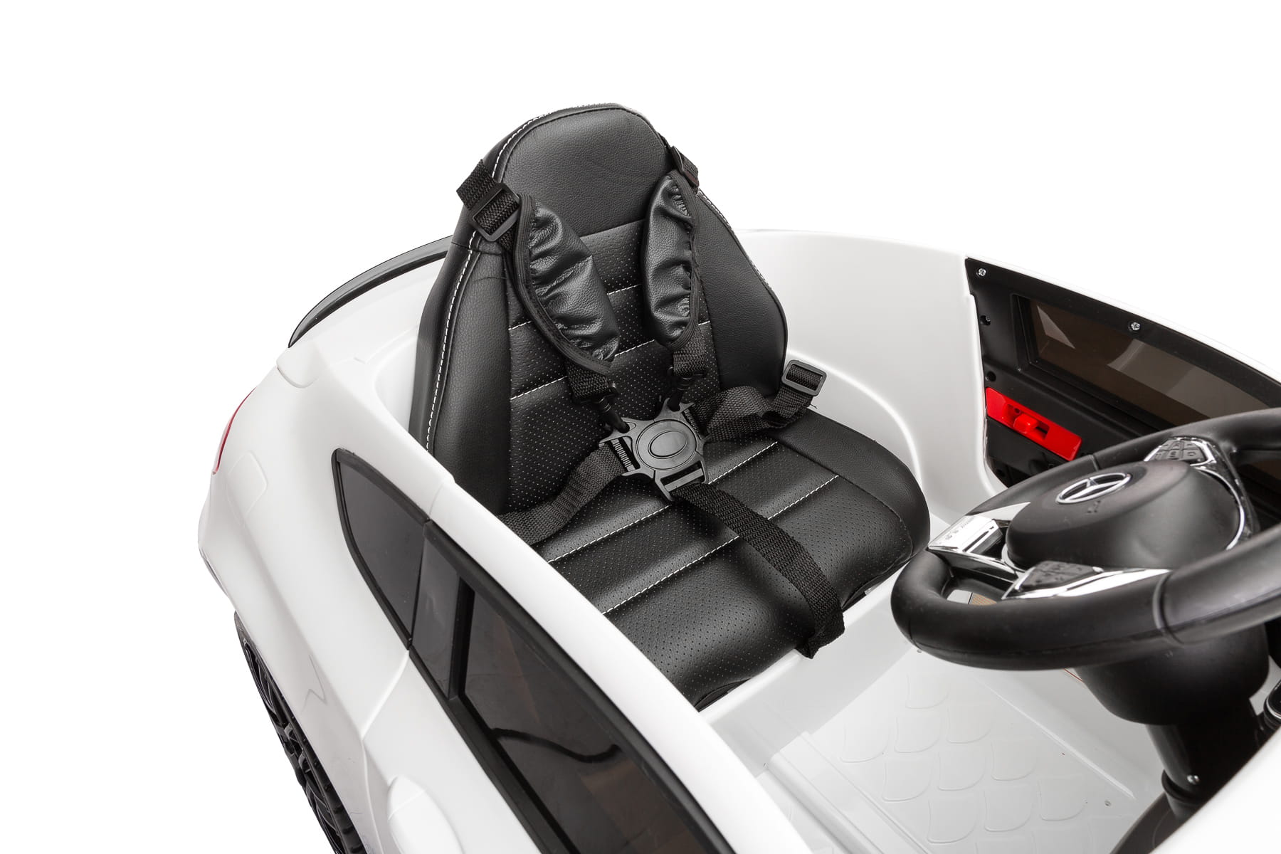 Mercedes AMG C 63 S – jak przystało na prawdziwego Mercedesa – łączy w sobie ponadczasową elegancję i sportowy charakter. Piękna linia nadwozia to tylko jeden dowód na to. Fotel kierowcy został obity stylową ekoskórą i wykończony białymi przeszyciami. Komfort jazdy podnoszą koła z pianki EVA. Zadbaliśmy również o komfort rodzica. Auto zostało wyposażone w system ułatwiający przenoszenie – wysuwany uchwyt i dodatkowe kółka. Oczywiście, jak w każdym naszym pojeździe, nie zapominamy o bezpieczeństwie zabawy. Nowością są 5-punktowe pasy bezpieczeństwa z obszyciami z ekoskóry. Ponadto auto standardowo wyposażone jest w automatyczny hamulec oraz posiada pilot zdalnego sterowania.