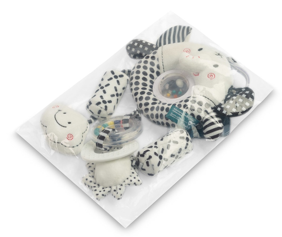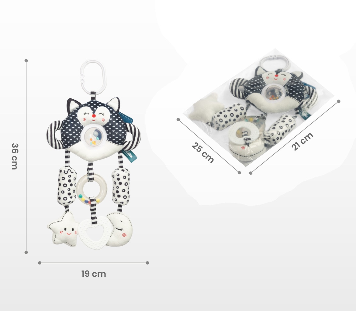 Zabawka wykonana jest z miękkich, miłych w dotyku materiałów w kontrastowych kolorach, które zachęcą maluszka do zabawy z dołączonymi zawieszkami sensorycznymi.